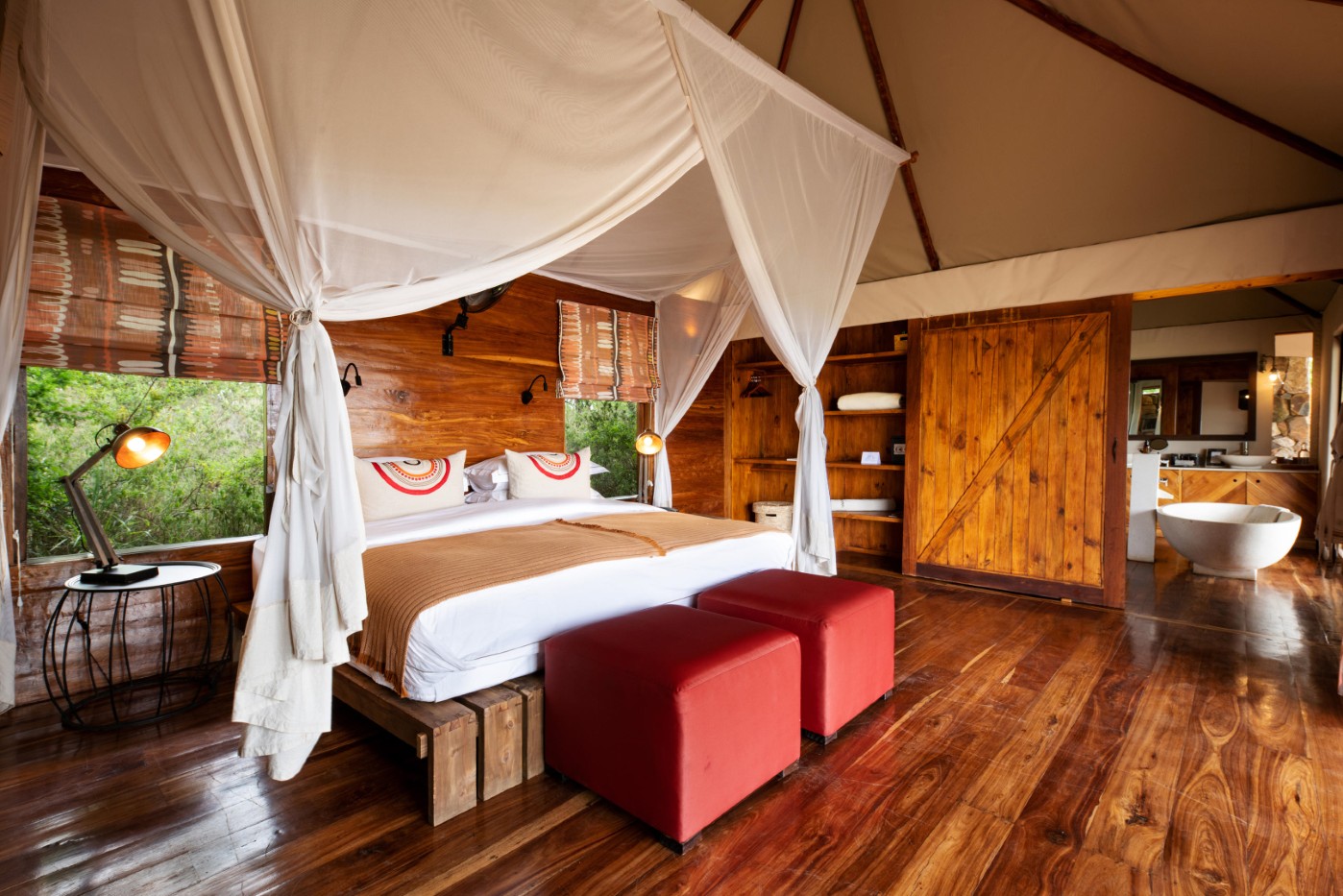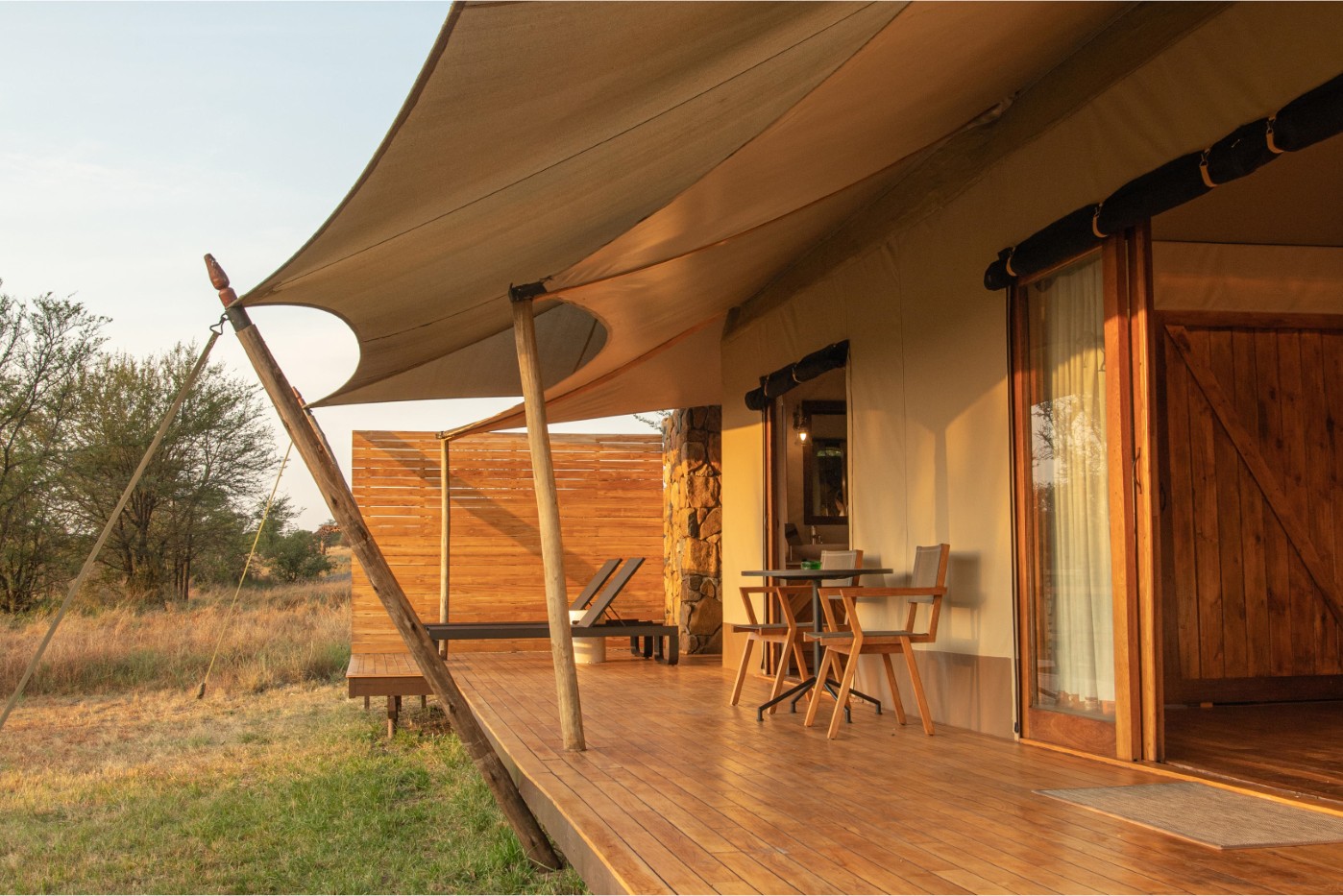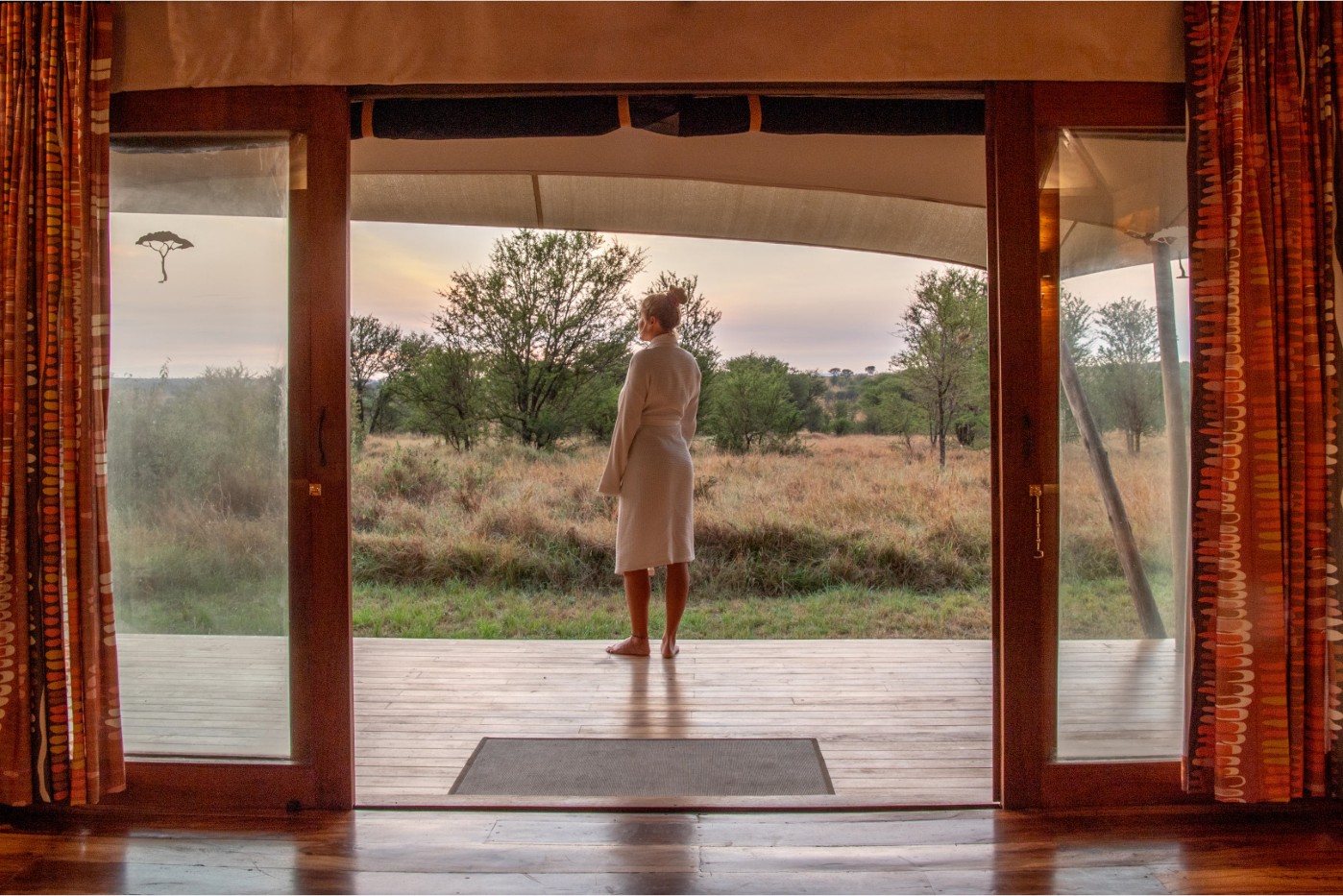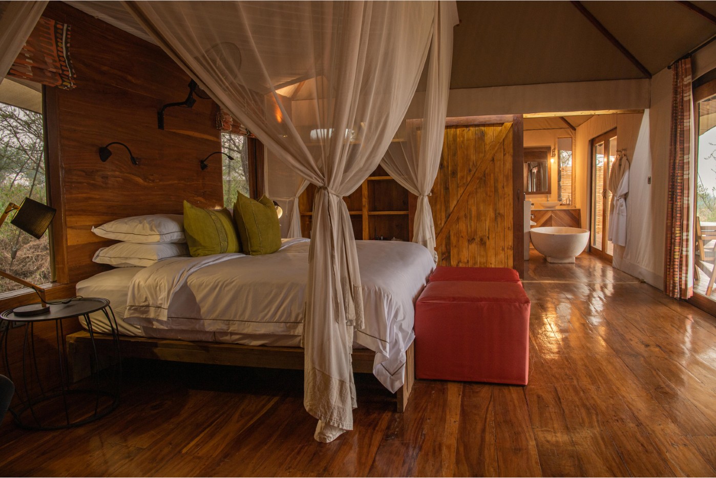 At Sayari Camp in the Serengeti, 15 spacious and light-filled tented suites blend comfort with style, featuring polished mahogany floors and king or twin beds dressed in fine linens and colourful cushions. Each suite includes a luxury safari bathroom with walk-in showers, freestanding tubs overlooking the savannah, and a private outdoor shower on your deck. Guests can unwind on the large wraparound veranda with a book or cold drink while watching wildlife roam past.